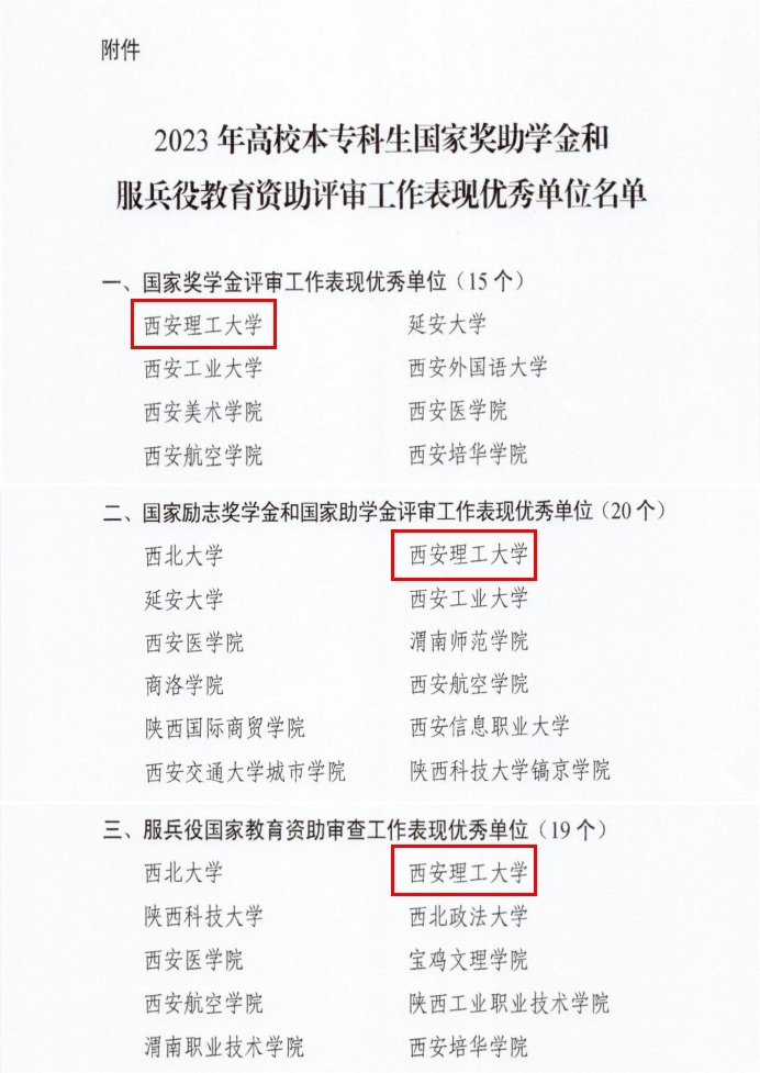 近日,陕西省教育厅印发了《陕西省教育厅办公室关于对2023年高校本专科生国家奖助学金和服兵役教育资助评审工作表现优秀单位进行表扬的通知》,我校分别荣获本专科生国家奖学金、国家励志奖学金和国家助学金、服兵役国家教育资助评审工作“表现优秀单位”,为全省仅有的5所“全优”院校之一。