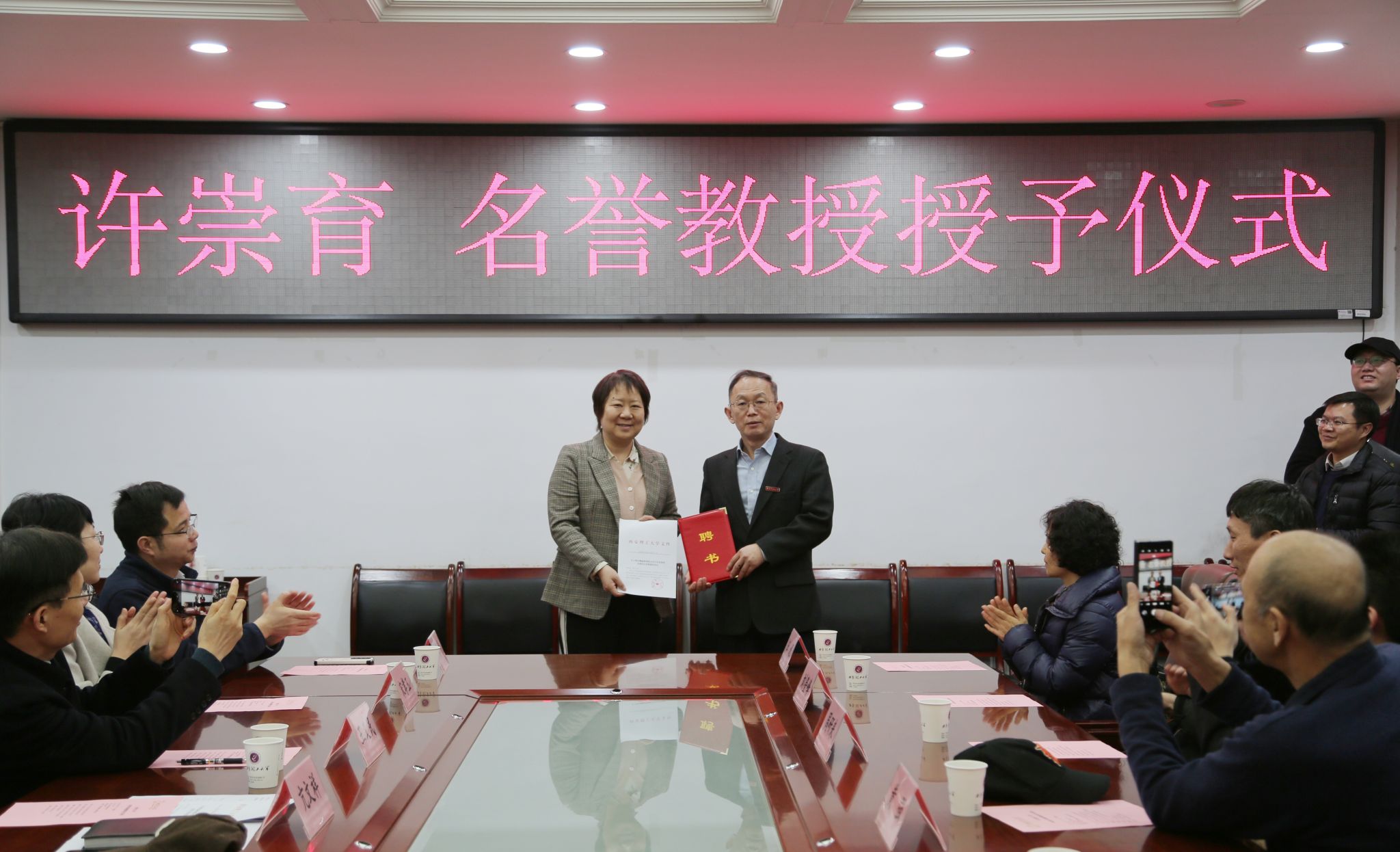 授予仪式上,水利水电学院院长郭鹏程介绍了许崇育院士的研究领域及学术贡献,亢文祥代表学校宣读了关于聘任许崇育院士为我校名誉教授的文件,申烨华为许崇育院士颁发了聘书、佩戴taptap体育彩票校徽,学生代表向许崇育院士献花。