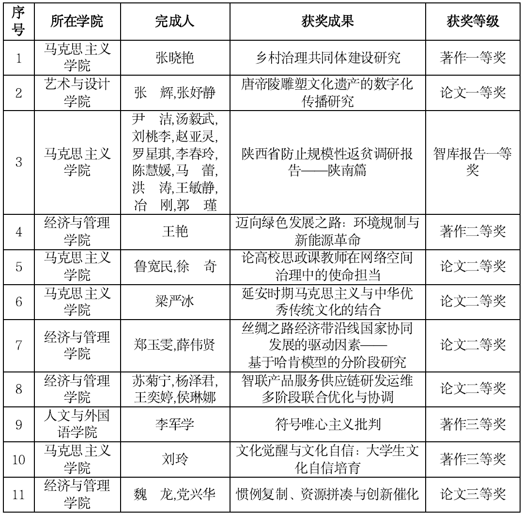 近日,陕西省人民政府发布《关于表彰第十六次哲学社会科学优秀成果的通报》(陕政字【2024】7号),我校获奖11项,其中一等奖3项,二等奖5项,三等奖3项。