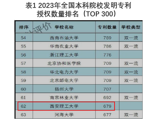 全国本科院校2023年发明专利授权数量统计数据显示,我校以679件授权发明专利排名全国本科院校第62位,位列在陕高校第4位。