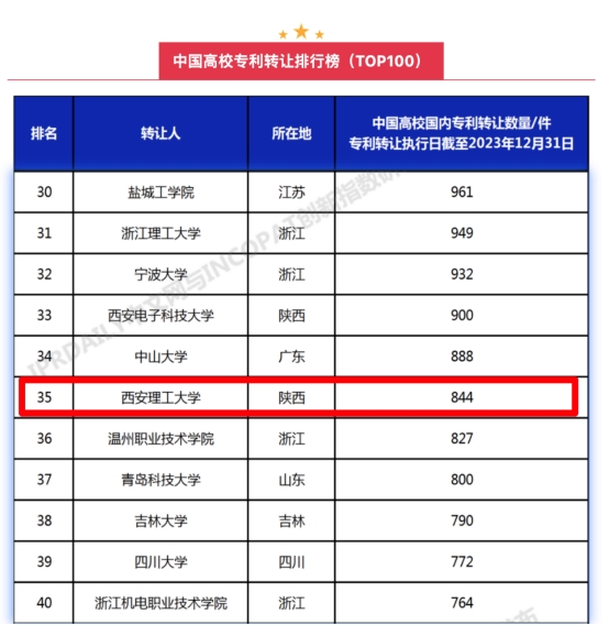 近期,全球知识产权综合信息服务提供商IPRdaily与incoPat创新指数研究中心统计分析了中国高校在国家知识产权局登记生效的专利申请权和专利权转让数量(不含港澳台)(数据截至2023年12月31日),我校共转让专利844件,位列“中国高校专利转让排行榜(TOP100)” 第35位,位列在陕高校第5位。