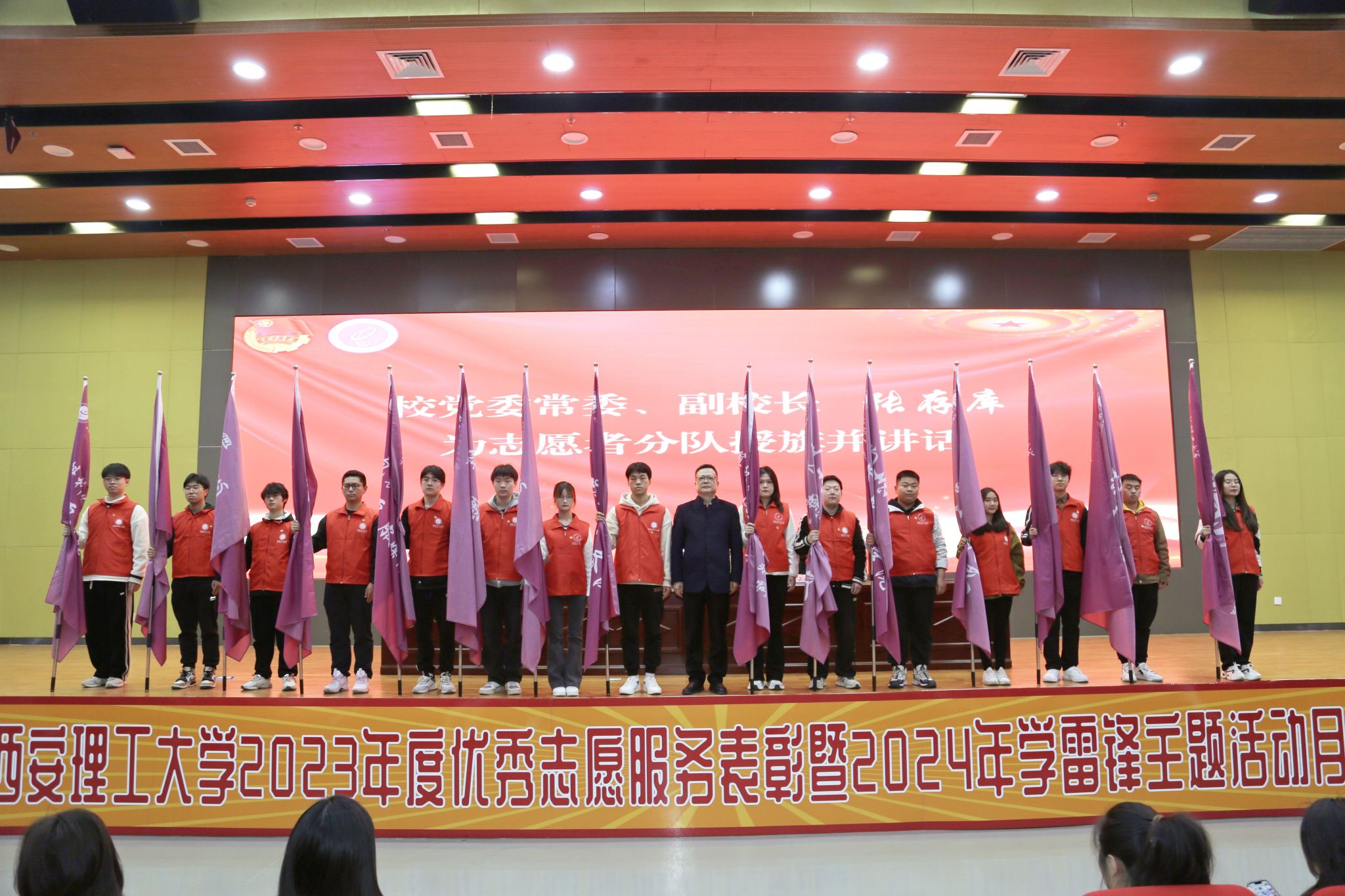 张存库为各学院志愿者分队授旗并讲话,他指出,雷锋的名字家喻户晓,雷锋的事迹深入人心,“学习雷锋好榜样”激励着一代又一代人忠诚于党、奉献祖国、服务人民,本次启动仪式既是对先进的表彰,又是落实立德树人根本任务实践育人关键环节、共建和谐美好校园的一次实际行动。他就我校团员青年进一步学习雷锋精神提出三点意见:一是在学习雷锋精神上要内化于心,把学习雷锋精神作为一种长期、系统、全面的过程;二是在开展志愿服务上要向下扎根,把雷锋精神代代传承下去;三是在实现自我提升上要向阳生长,树立正确劳动观,成为劳动精神的弘扬者、引领者。他强调,全校师生应以本次启动仪式为新的起点,掀起传承雷锋精神、争做时代新人的热潮,积极投身国家发展、社会所需、学校建设,着眼于身边小事,共建和谐美丽校园。