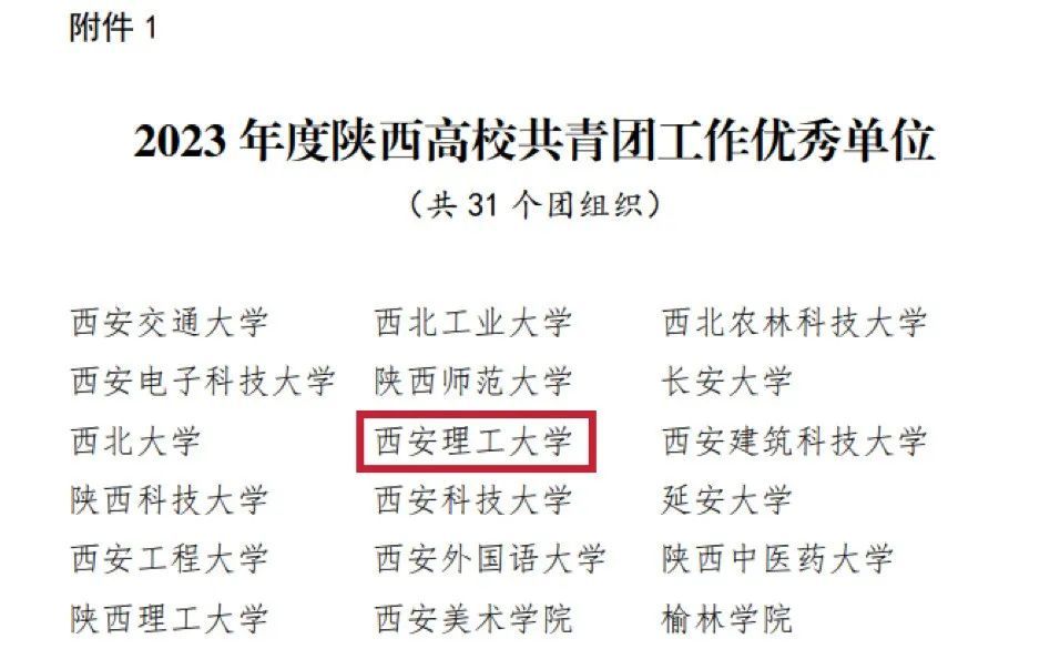 2023年,我校团委获评陕西省五四红旗团委,全国“三下乡”社会实践优秀单位,省级社会实践示范学校;我校在第十三届“挑战杯”中国大学生创业计划竞赛中获1金、1银、3铜,在第十八届“挑战杯”全国大学生课外学术科技作品竞赛中,荣获一等奖2项,二等奖3项,三等奖1项,科技赛事获奖实现新突破。在陕西省团干部素质能力大赛中获一等奖2项,二等奖3项,三等奖1项,优秀奖2项,学校荣获优秀组织奖。在陕西省第七届大学生艺术展演活动中,师生作品获奖共36项,同时,荣获大赛优秀组织奖。我校7个志愿服务项目入选陕西省志愿服务项目大赛金、银、铜奖,获西安市青年志愿服务项目大赛金奖1项、银奖1项、铜奖1项、优秀奖4项。