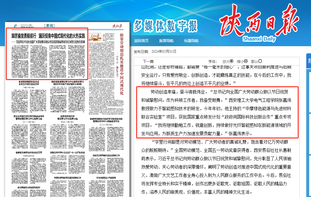 作为科技工作者代表,我校电气工程学院张嘉伟教授表示,“习近平总书记向全国广大劳动群众致以节日祝贺和诚挚慰问。作为科研工作者,备受鼓舞。我将继续勤勉工作,锐意创新,持续做好光纤智能感知在新能源领域的开发与应用,为新质生产力加速发展贡献力量。”