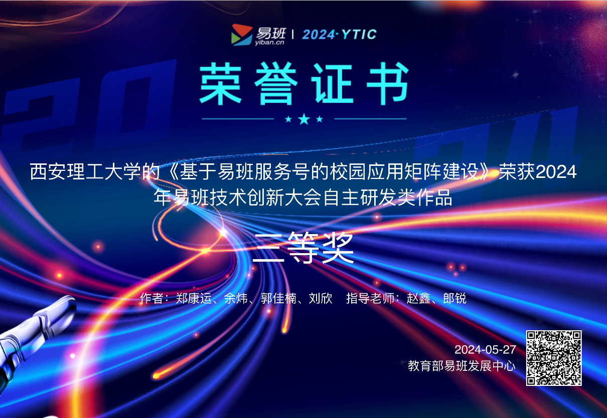 5月25日至27日,2024年全国高校易班技术创新大会在海南陵水黎安国际教育创新试验区举行。我校易班发展中心赵鑫和郎锐担任指导教师,计算机学院郑康运、余炜、郭佳楠,艺术学院刘欣等同学共同参与完成的“基于易班服务号的校园应用矩阵建设”项目获2024年全国高校易班技术创新大会自主研发类三等奖,也是我校首次荣获该赛事奖项。