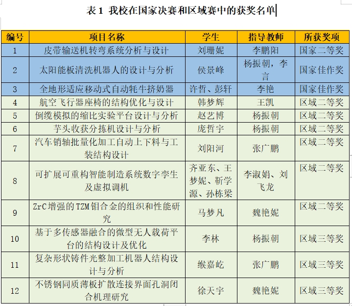 本届大赛自去10月底正式启动以来,得到了联盟高校和企业的广泛关注和大力支持,在题目征集阶段收到来自全国135所高校和企业的2137项题目。区域赛阶段,共有119所高校提交了1139项作品,最终来自99所高校的228项作品获区域赛一等奖,入围决赛。我校在区域赛阶段获得区域一等奖3项、二等奖6项、三等奖3项,最终3项作品入围决赛。决赛阶段,来自清华大学、上海交通大学、浙江大学等高校的参赛队伍分为12组,经过激烈角逐,最终评选出国家一等奖12项(含金奖2项、银奖10项),二等奖(铜奖)24项,三等奖(优秀奖)60项和佳作奖132项。我校最终获得国家二等奖(铜奖)1项和佳作奖2项。