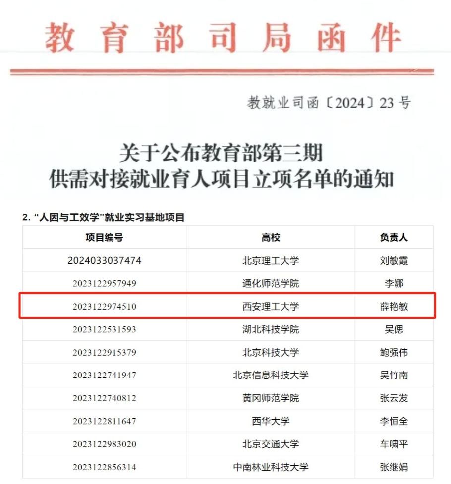 本次获批的就业实习基地项目属于教育部“供需对接就业育人项目”之一,负责人为薛艳敏教授。该项目聚焦人因工程与工效学领域,围绕国家制造强国战略,结合学院“艺工同治”的办学特色,利用优质企业资源,共建“人因与工效学”就业育人基地,为毕业生提供优质的实习岗位,助力毕业生顺利就业。
