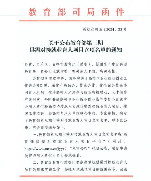 近日,教育部印发了《关于公布教育部第三期供需对接就业育人项目立项名单的通知》(教就业司函〔2024〕23号),文件公布了教育部第三期供需对接就业育人项目立项名单。我校共有37个项目获批立项。