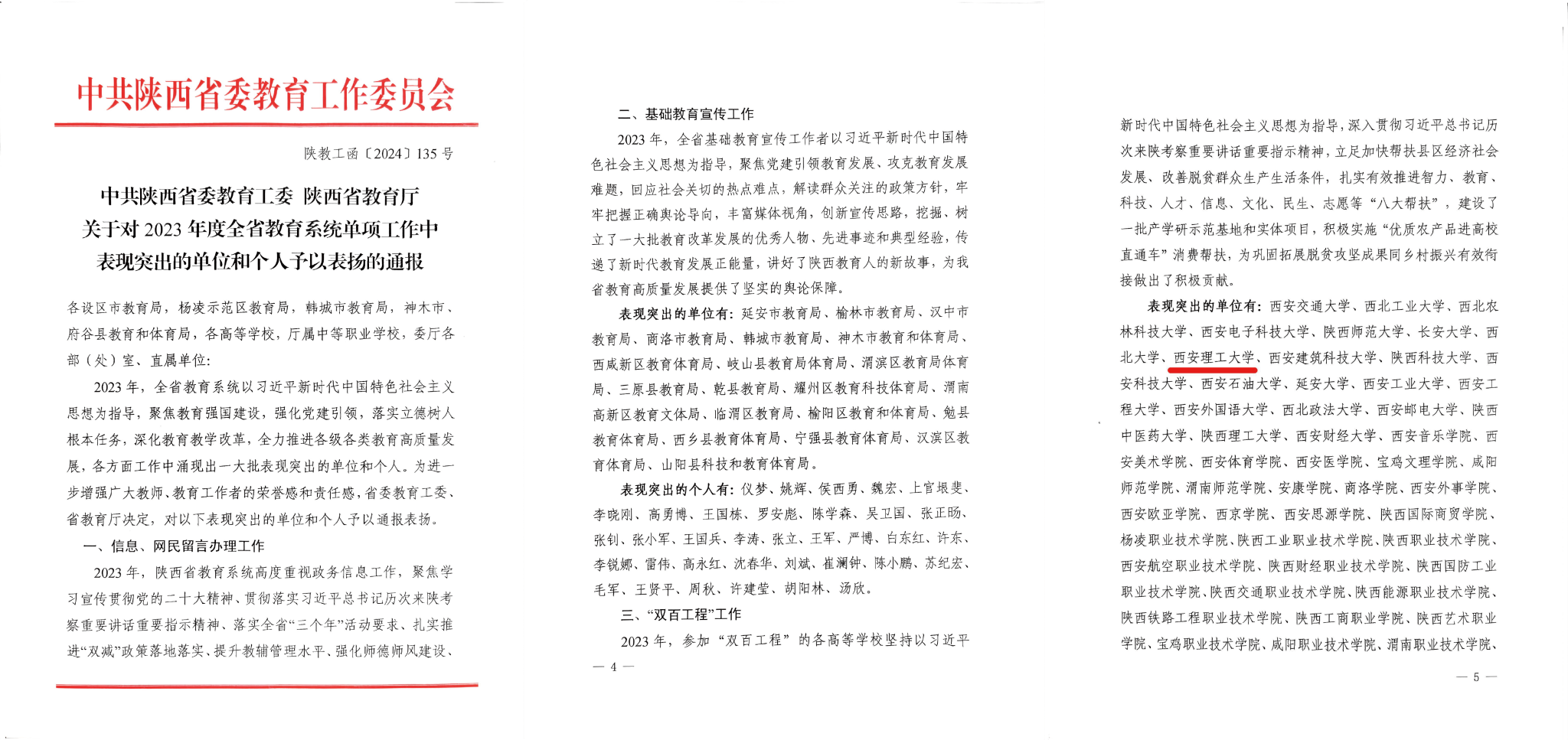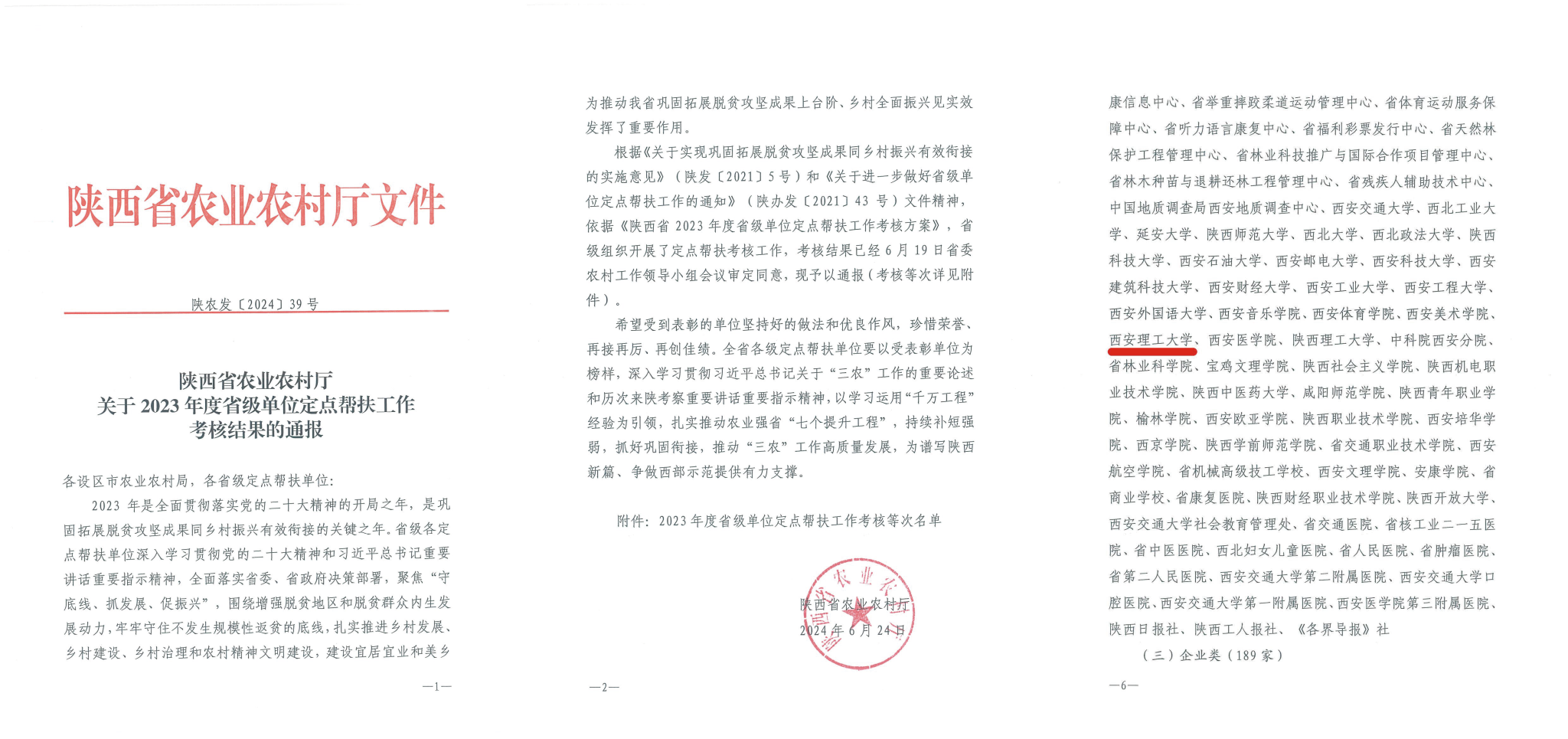 近日,中共陕西省委教育工委、陕西省教育厅联合发布了《关于对2023年度全省教育系统单项工作中表现突出的单位和个人予以表扬的通报》,我校在“双百工程”工作中表现突出;陕西省农业厅发布了《关于2023年度省级单位定点帮扶工作考核结果的通报》,我校在定点帮扶工作考核中被评定为“好”等次,这是我校连续第九次获得此项荣誉。