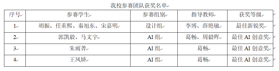 来自国内外的百余件设计作品经过激烈角逐,最终评选出金奖1名、银奖3名,铜奖8名,新锐奖20名,AI创意奖10名。其中,我校艺术与设计学院胡振、任重熙、秦旭东、宋嘉明团队在教师李博、薛艳敏指导下,荣获最佳新锐奖;郭凯毅、马文宇团队在教师葛畅、周毅晖的指导下,获最佳AI创意奖;朱雨菁、王凤娇两个团队在教师葛畅指导下获得了最佳AI创意奖。