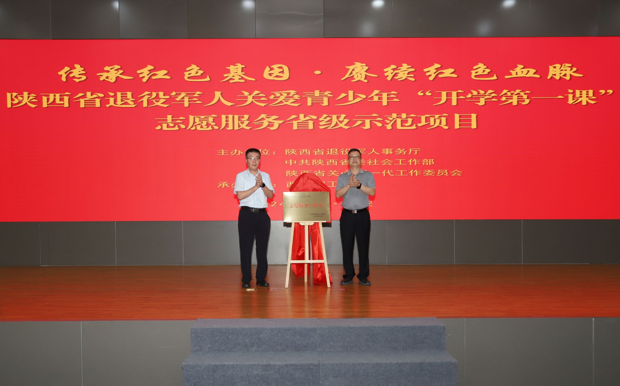 张存库和吴向荣为陕西省退役大学生士兵志愿服务工作室揭牌。与会领导为我校退役大学生士兵代表发放志愿服务礼包。