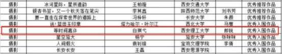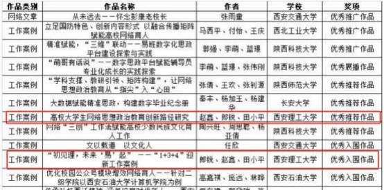 由我校经济与管理学院蒋艾琳老师指导, 张浩、李博、 尹莹琪、夏玺玥、蒋佳琪、郭礼阳等同学创作的作品《喂,天空快亮了》入选微视频赛道优秀展播作品;由易班发展中心郎锐老师指导,白琪弋同学拍摄的作品《等时间嘉许》 入选摄影赛道优秀入围作品; 由学工部易班发展中心报送的工作案例《高校大学生网络思想政治教育创新路径研究》和《“初见理,未来‘易’起”——“ 1+3+4”迎新工作案 例》入选优秀工作案例榜单。