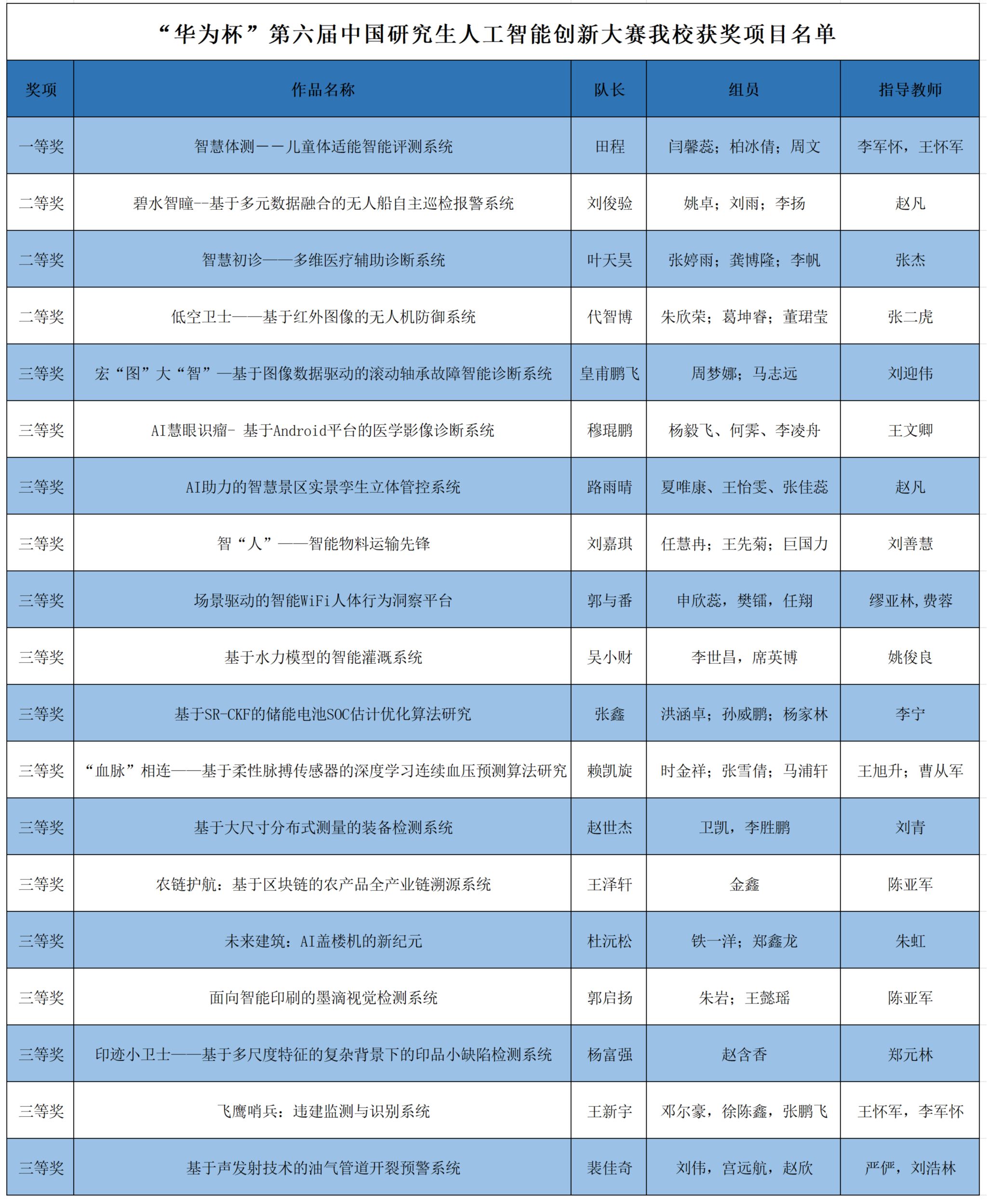 9月25日-26日,“华为杯”第六届中国研究生人工智能创新大赛决赛在哈尔滨举行。经过激烈角逐,我校“智慧体测--儿童体适能智能评测系统”作品荣获全国一等奖,“碧水智瞳--基于多元数据融合的无人船自主巡检报警系统”等3项作品荣获二等奖,“AI慧眼识瘤--基于Android平台的医学影像诊断系统”等15项作品荣获三等奖,我校获优秀组织奖。