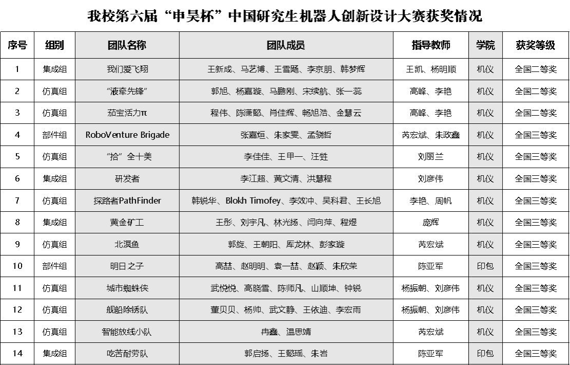 10月24-25日,“申昊杯”第六届中国研究生机器人创新设计大赛决赛在辽宁沈阳举行,我校参赛研究生团队获全国二等奖3项、三等奖11项,以总得分全国第四获评优秀组织单位,获奖项数位列全国第三,综合成绩位居陕西高校第一,创参赛以来最好成绩。