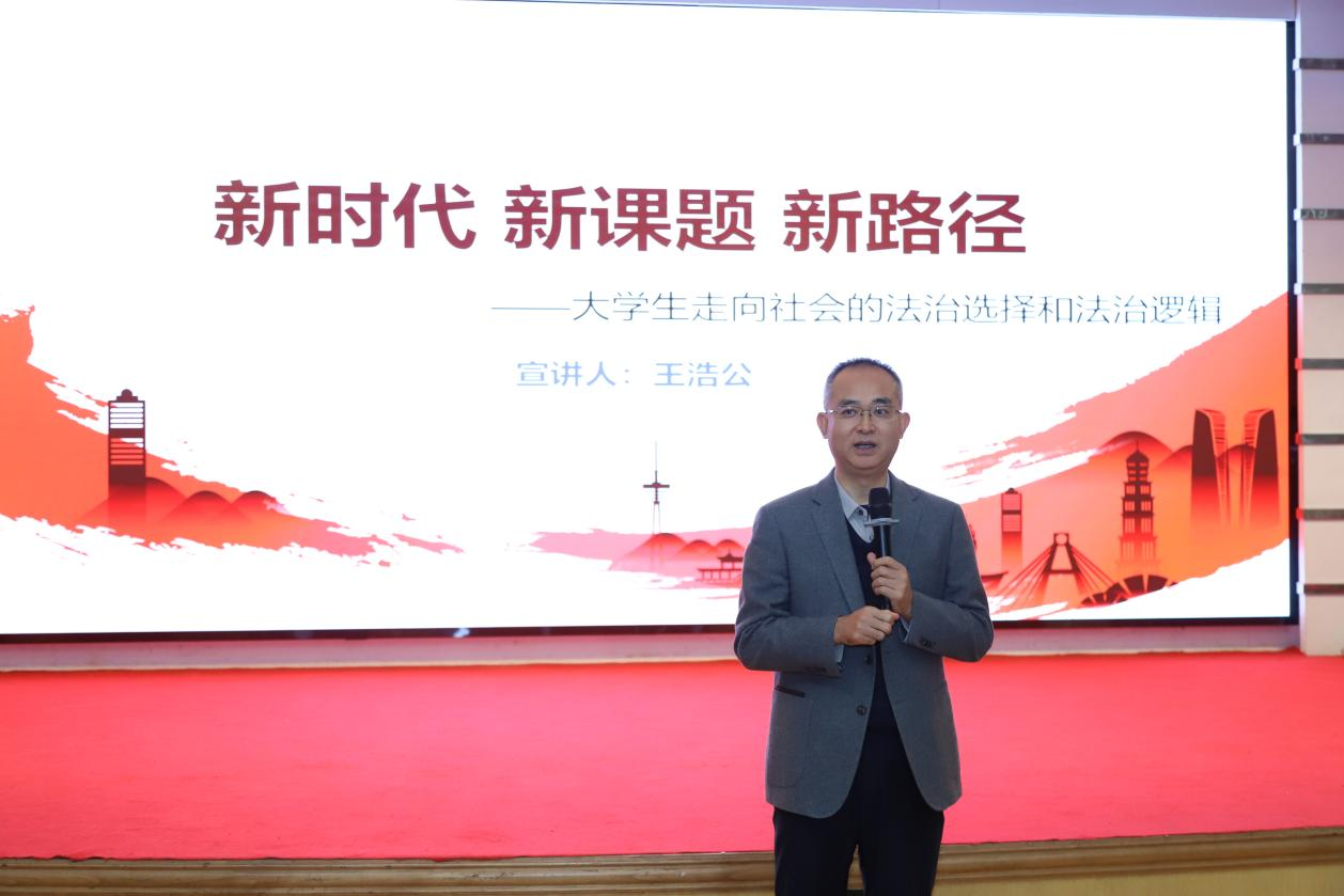 王浩公以《新时代 新课题 新路径——大学生走向社会的法治选择和法治逻辑》为题,围绕大学生法治素养培育的核心要点展开讲解,他剖析了大学生如何运用法治视角洞察当今社会问题,为大学生依法参与社会事务提供了清晰指引;阐述了大学生在就业创业过程中面临的法律风险与应对策略,助力学生在未来职业道路上稳健前行;以“人生之路,用法解决困难之旅”为切入点,通过生动案例教导学生如何借助法律武器化解生活中的难题,为学生们的个人成长保驾护航。