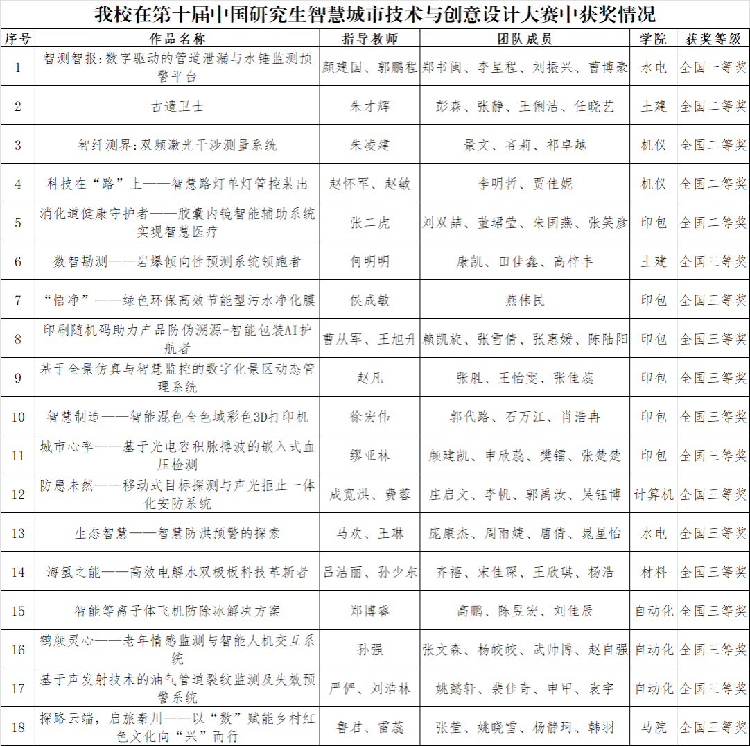 12月11日-13日,第十届中国研究生智慧城市技术与创意设计大赛总决赛在重庆大学举办,我校研究生参赛团队获全国一等奖1项、二等奖4项、三等奖13项,总分位列全国第七,连续十届获评“优秀组织奖”,颜建国、郭鹏程获评优秀指导教师。
