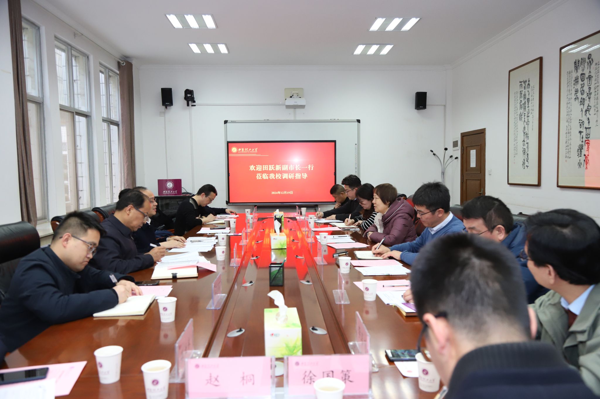 12月19日下午,渭南市副市长田跃新一行到我校调研交流。我校党委书记李智军在第一接待室与田跃新进行会谈。座谈交流会在第一会议室举行,校党委常委、副校长申烨华出席并致辞,会议由我校新质生产力创新中心主任游才印主持。