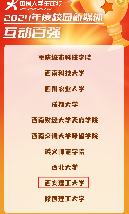 12月26日,教育部中国大学生在线公布2024年度校园新媒体表彰名单,我校获“校园新媒体互动百强”荣誉称号。