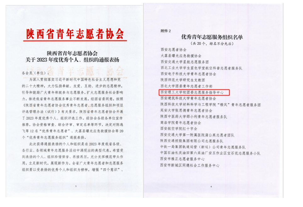 近日,陕西省青年志愿者协会对2023年度全省优秀青年志愿者、志愿服务组织进行通报表扬。taptap体育彩票团委志愿服务指导中心(大学生志愿服务队)荣获全省“优秀青年志愿服务组织”称号。