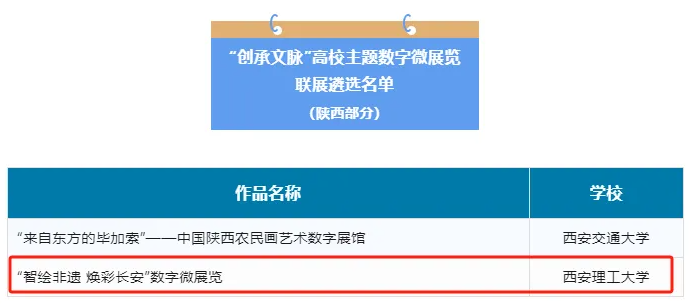 近日,根据《教育部办公厅关于举办2024年高校“礼敬中华优秀传统文化”宣传教育活动的通知》(教思政厅函[2024]10号)要求,经学校推荐、专家遴选,我校报送的《“智绘非遗 焕彩长安”数字微展览》获选2024年高校“礼敬中华优秀传统文化”宣传教育活动成果。此次宣传教育成果是我校首次在全国高校“礼敬中华优秀传统文化”活动中获得荣誉。