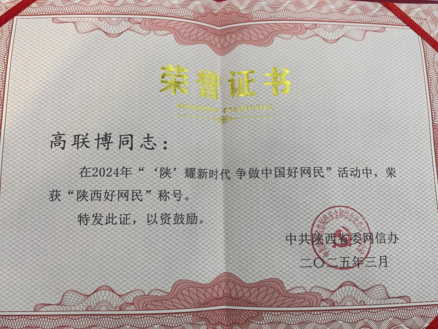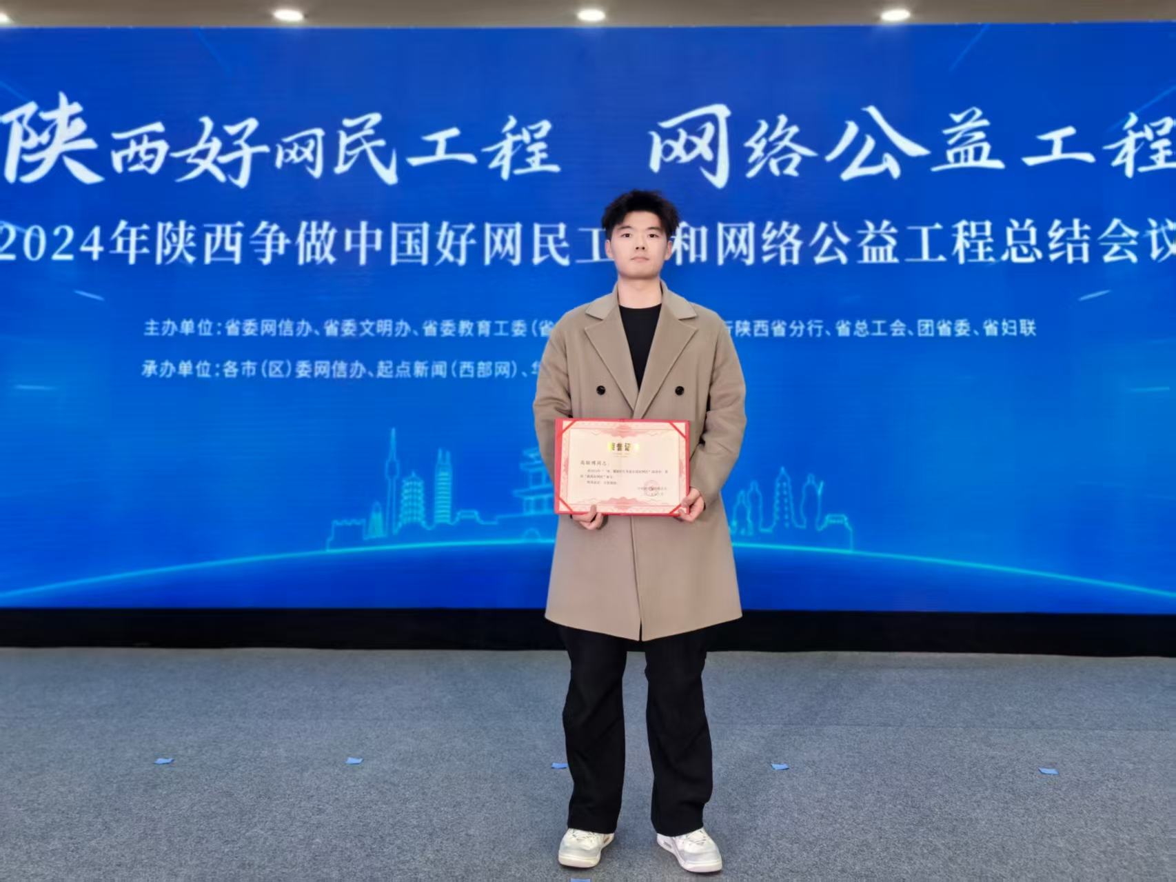 3月28日,2024年陕西争做中国好网民工程和网络公益工程总结会议召开。会上通报表扬了2024年陕西好网民、好网民工程品牌项目和优秀组织单位,我校计算机科学与工程学院研究生、党委宣传部学生助理高联博获评“陕西好网民”称号。此前,高联博获评省委教育工委评选的2024“陕西校园好网民”。
