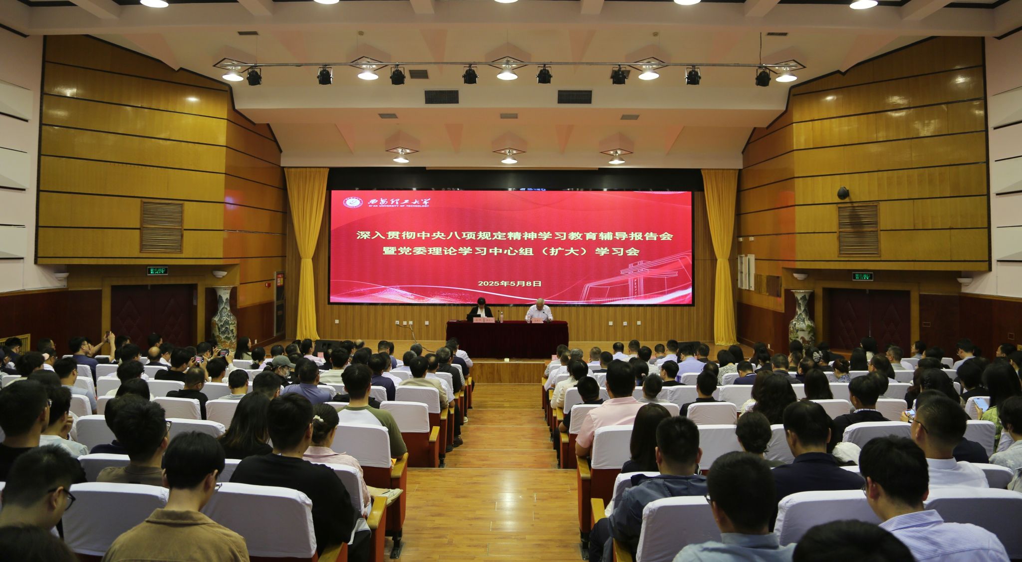 5月8日下午,我校在金花校区图书馆报告厅召开深入贯彻中央八项规定精神学习教育辅导报告会暨党委理论学习中心组(扩大)学习会。校党委书记李智军主持会议。