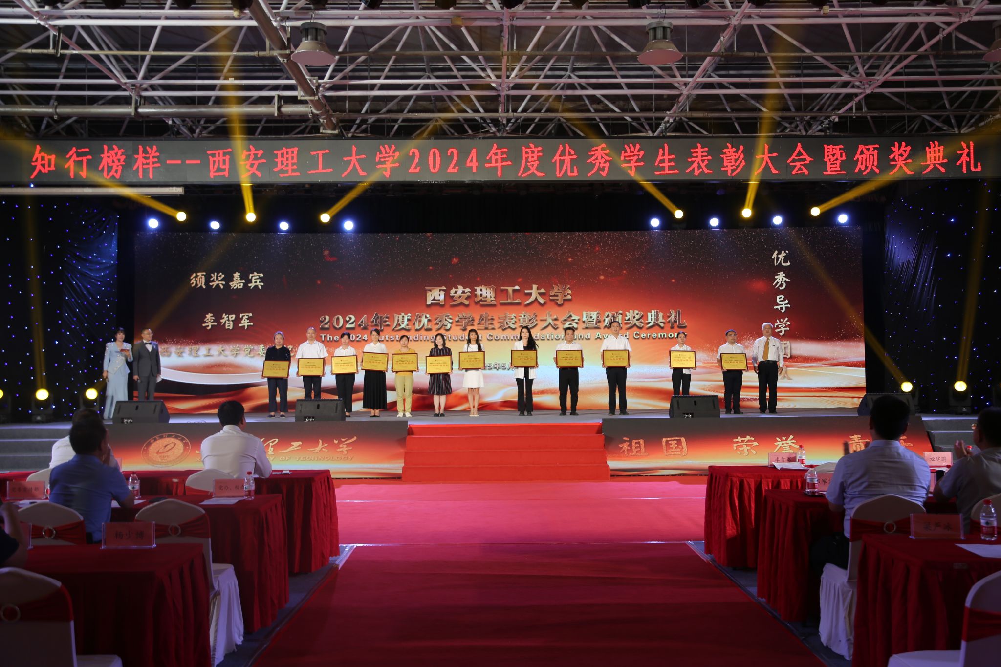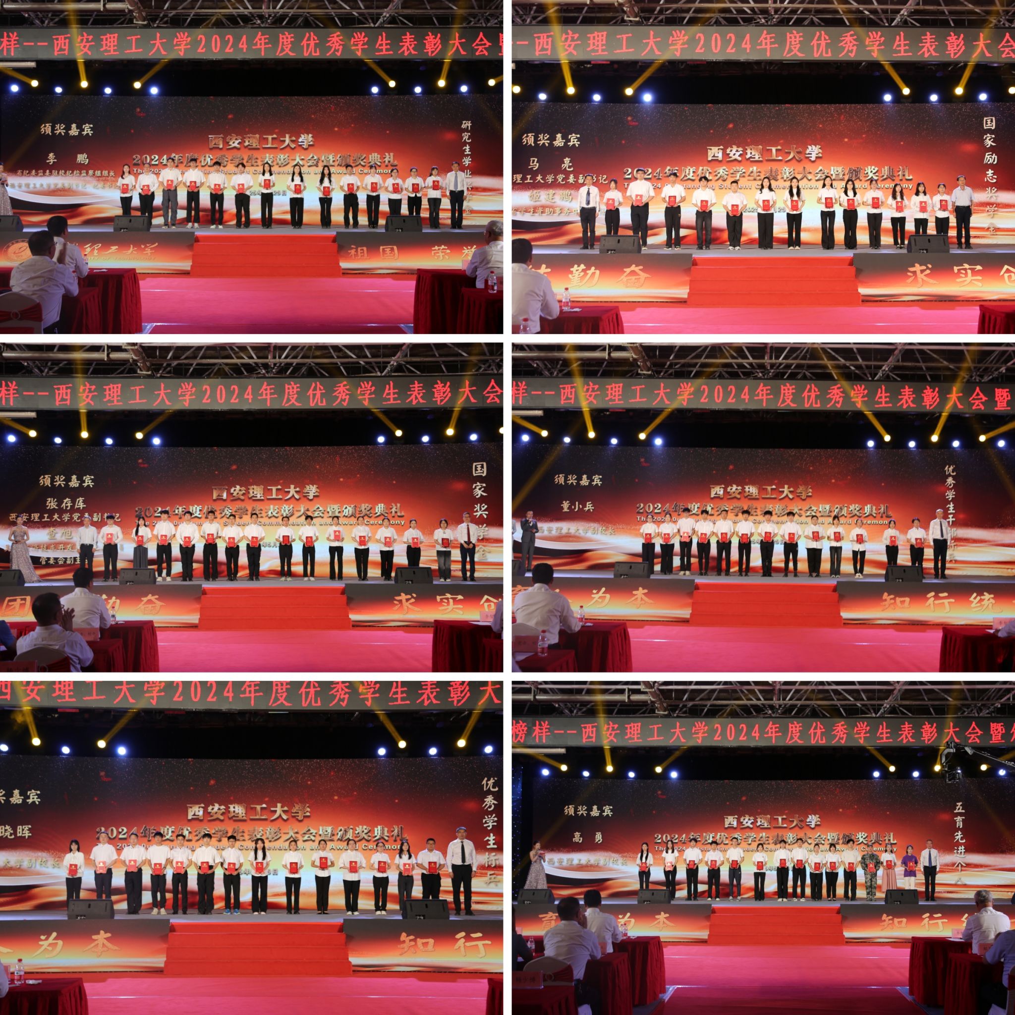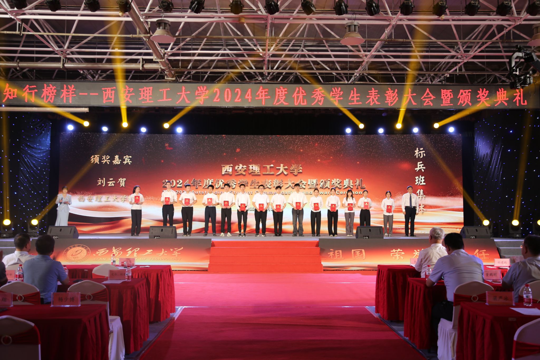 5月29日晚,我校在曲江校区大学生活动中心举行“知行榜样”2024年度优秀学生表彰大会暨颁奖典礼。陕西省学生资助事务中心主任姬建鹏,吴江经济技术开发区党工委委员、管委会副主任查旭东,校党委书记李智军,校长刘云贺,省纪委监委驻校纪检组组长、党委副书记、纪委书记李鹏,党委副书记马亮、张存库,副校长董小兵、张晓晖、高勇出席表彰大会并为获奖集体和个人颁奖。