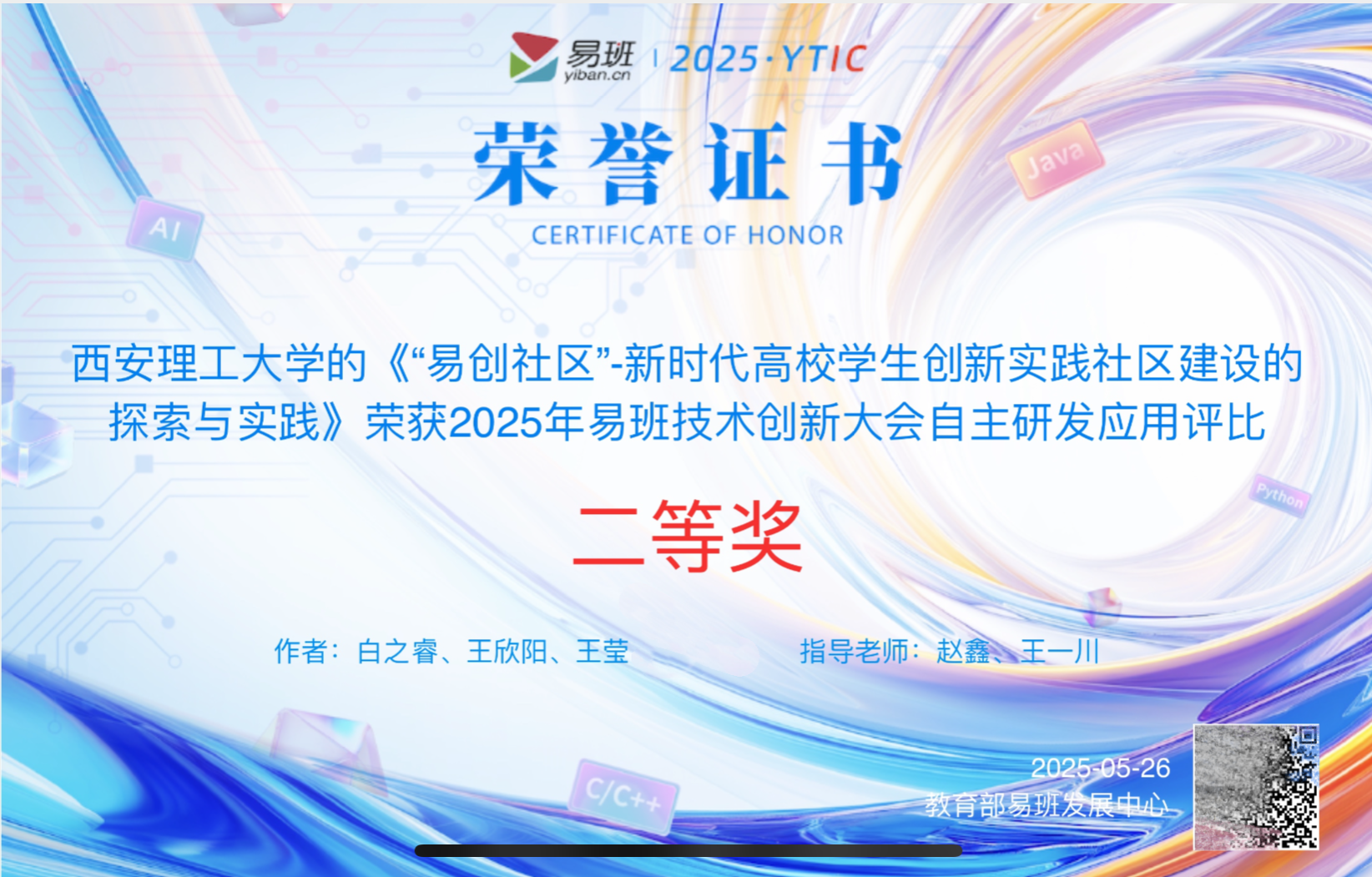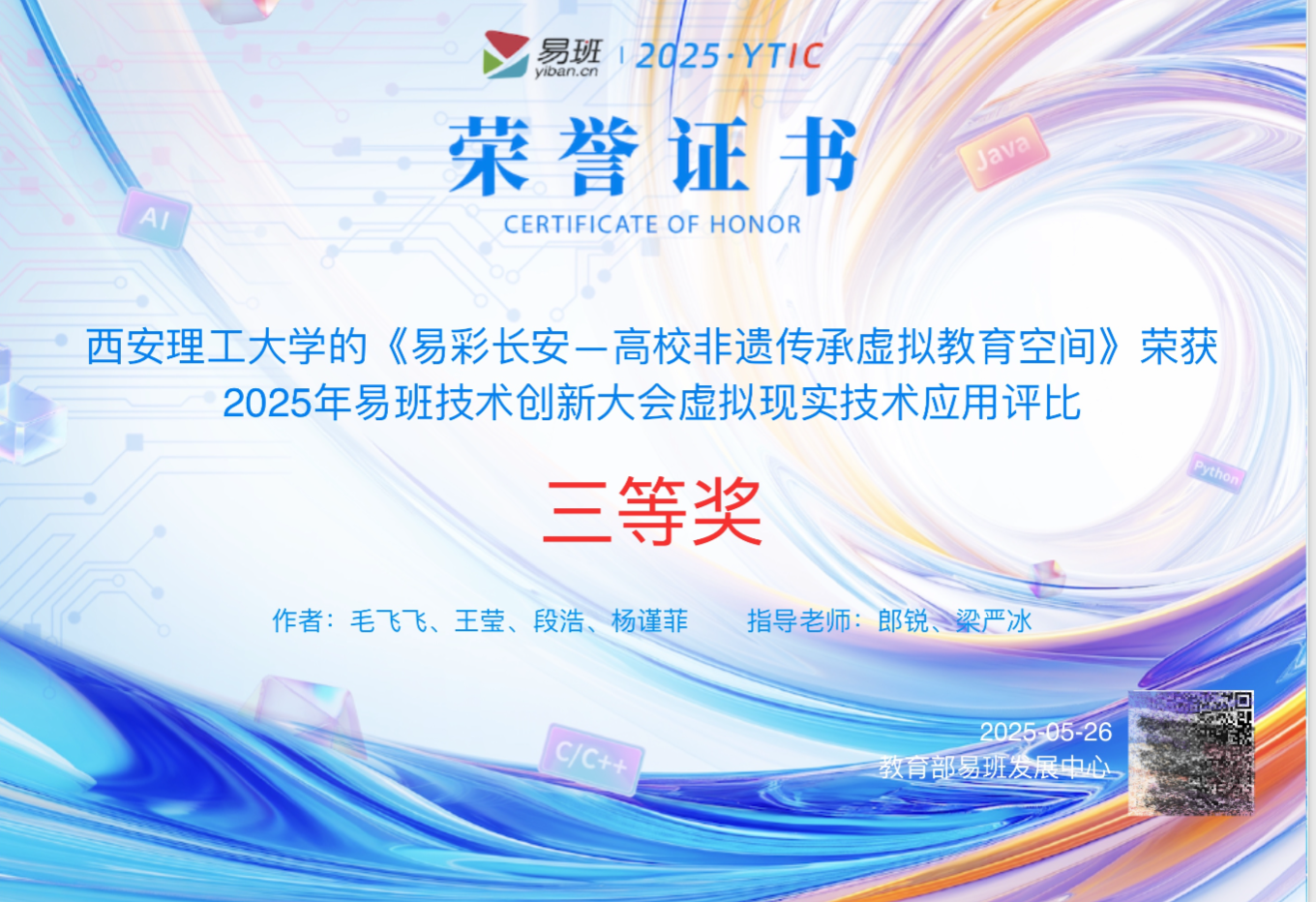 5月26日,第八届全国大学生网络文化节“数智新技艺”线下交流展示活动暨2025年全国高校易班技术创新大会在珠海落下帷幕,我校在此次赛事活动中斩获佳绩。其中,《“易创社区”-新时代高校学生创新实践社区建设的探索与实践》获得自主研发赛道二等奖,《“易见倾心”-AI赋能的大学生心灵疗愈生态圈》获得人工智能体AIGC应用赛道二等奖,《“易彩长安”-高校非遗传承虚拟教育空间》获得虚拟现实赛道三等奖,实现我校在该赛事上获奖赛道数量、获奖作品总量与获奖名次的新突破。