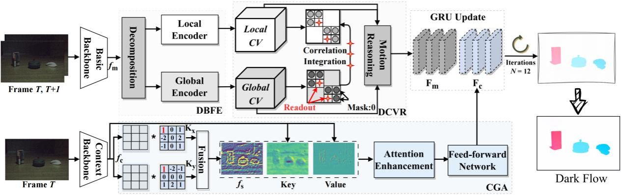 近日,我校计算机科学与工程学院金海燕教授团队在人工智能计算机视觉领域提出一种全新的基于隐空间轮廓增强的弱光光流估计方法。该方法通过局部与稀疏全局编码器同步捕捉细粒度及大尺度底层特征,借助双代价体推理策略高效提取场景整体运动亲和性并缓解歧义。同时,特别修改Sobel核参数自适应提取适配运动边界的大尺度轮廓特征。大量的对比实验及分析表明,该成果方法能够在弱光条件下得到更为准确和鲁棒的光流估计。