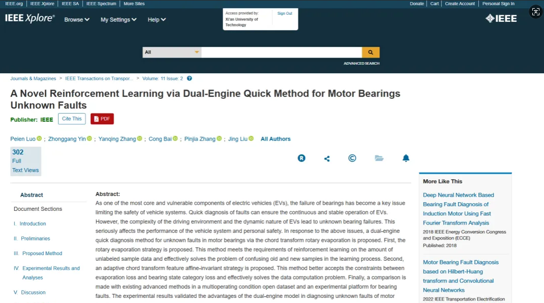 近日,以我校电气工程学院罗培恩博士为第一作者的论文“A Novel Reinforcement Learning via Dual-Engine Quick Method for Motor Bearings Unknown Faults”(一种用于电机轴承未知故障的新型强化学习双引擎快速诊断方法),发表于《IEEE Transactions on Transportation Electrification》(SCI 一区TOP,影响因子:8.3)2025 年第11卷第2期。