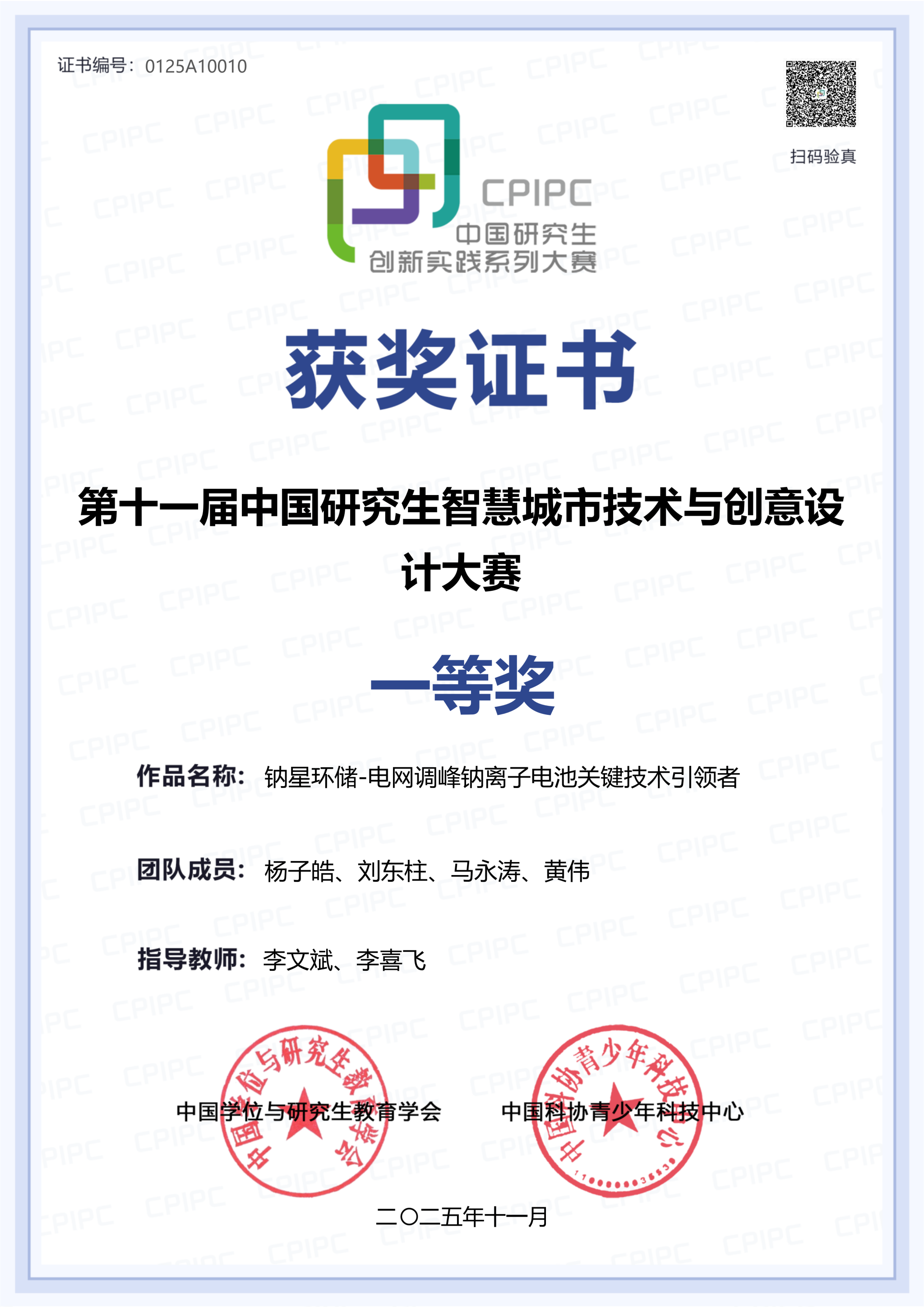 近日,第十一届中国研究生智慧城市技术与创意设计大赛在武汉大学举办。我校参赛队作品“钠星环储——电网调峰钠离子电池关键技术引领者”在参加决赛的192支团队中脱颖而出,与浙江大学、武汉大学、西北工业大学、西安电子科技大学的其他5支团队进入冠军争夺赛的角逐,位列全国第四名。最终,我校荣获全国一等奖1项,三等奖4项,李文斌、李喜飞获“优秀指导教师”称号,我校连续第11届荣获“优秀组织单位”称号。