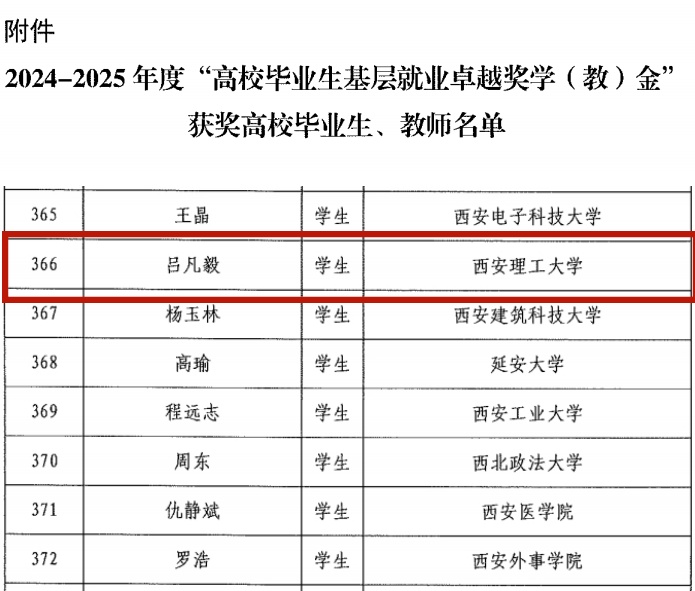 近日,中国教育发展基金会公布2024-2025年度“高校毕业生基层就业卓越奖学(教)金”人选名单, 我校土木建筑工程学院2017届本科毕业生吕凡毅荣获全国高校毕业生基层就业卓越奖学金。
