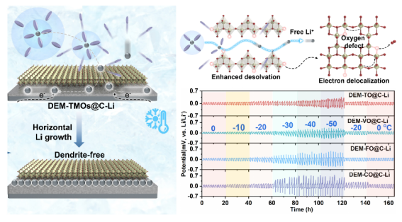 研究采用电子离域工程调控催化剂活性,催化重构在低温环境下[Li(solvent)x+]基团的溶剂鞘层,快速脱出自由Li离子,加快离子扩散动力学抑制枝晶生成。筛选了一系列d轨道离域的金属氧化物(M= Ti, V, Fe, Co),在系列电极/电解质界面上进行了系统的理论模拟和实验筛选,揭示了电子结构优化对调节离子-偶极相互作用调控溶剂化结构,促进离子传输实现低温长寿命锂金属电池的催化机制。