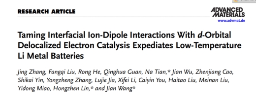 近日,我校材料科学与工程学院金属功能材料团队在能源电极材料领域取得重要学术进展,相关研究成果以《Taming Interfacial Ion-Dipole Interactions With d-Orbital Delocalized Electron Catalysis Expediates Low-Temperature Li Metal Batteries》为题发表于材料领域国际著名期刊《Advanced Materials》(影响因子26.8)。该成果由taptap体育彩票联合中科院苏州纳米、德国亥姆赫兹电化学研究所合作完成,taptap体育彩票为第一作者单位,材料科学与工程学院张静副教授为论文第一作者,taptap体育彩票田娜教授、中科院苏州纳米所蔺洪振研究员和德国亥姆赫兹电化学研究所王健研究员为论文的共同通讯作者。